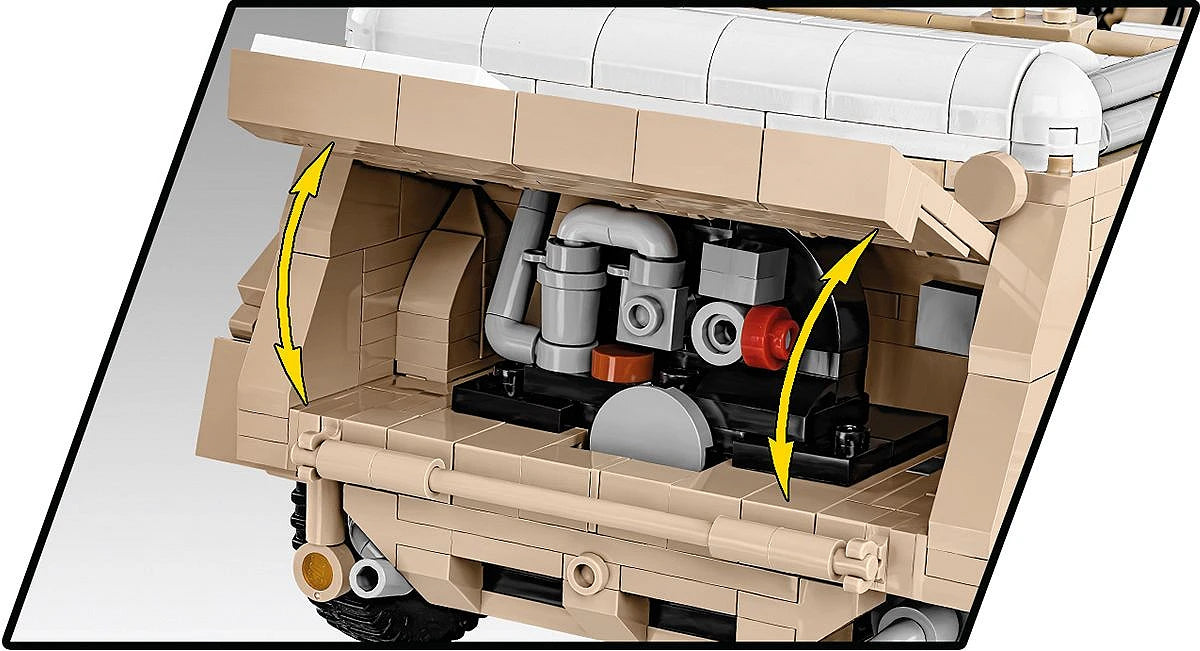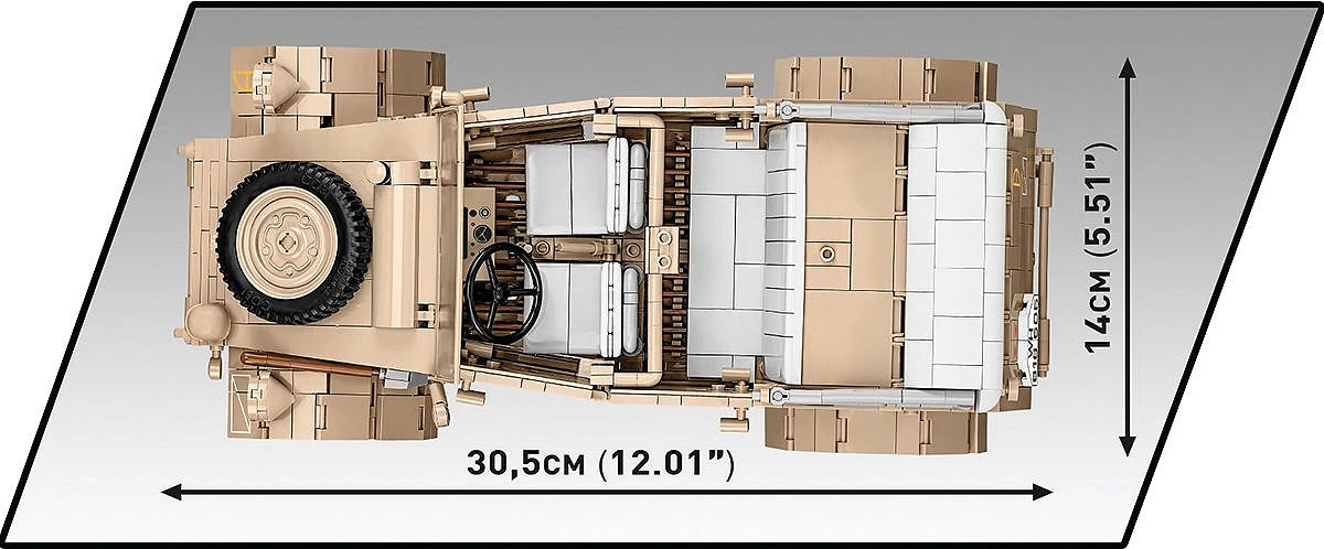 Con 1326 piezas y generosas dimensiones, este set (n.° 2803) es único en su clase. Una vez terminado, el Kübelwagen mide 30,5 cm de largo. Llama la atención su interior cuidadosamente reproducido, el excelente diseño exterior y los elementos completamente nuevos diseñados específicamente para las necesidades de un set tan grande. El interior del vehículo está completamente detallado, incluyendo el volante, los asientos, los mandos, los interruptores y el compartimento del motor, que contiene herramientas adicionales. El exterior también eleva el listón en cuanto a precisión de proporciones y detalle, algo que solo un set de este tamaño puede ofrecer. Esto incluye una ventana exclusiva, puertas que se abren, acceso al maletero y al compartimento del motor, elementos de equipamiento y ruedas giratorias que se mueven con el volante. Nuestros modelos a escala 1:28 se consideran muy detallados. Sin embargo, es la escala 1:12 y los 1530 elementos los que nos permiten mostrar las verdaderas capacidades del sistema de bloques de construcción COBI. El Kübelwagen representa un nuevo nivel de diseño, fotorrealismo, tamaño impresionante y precisión. ¡En este caso, la cantidad de bloques importa!